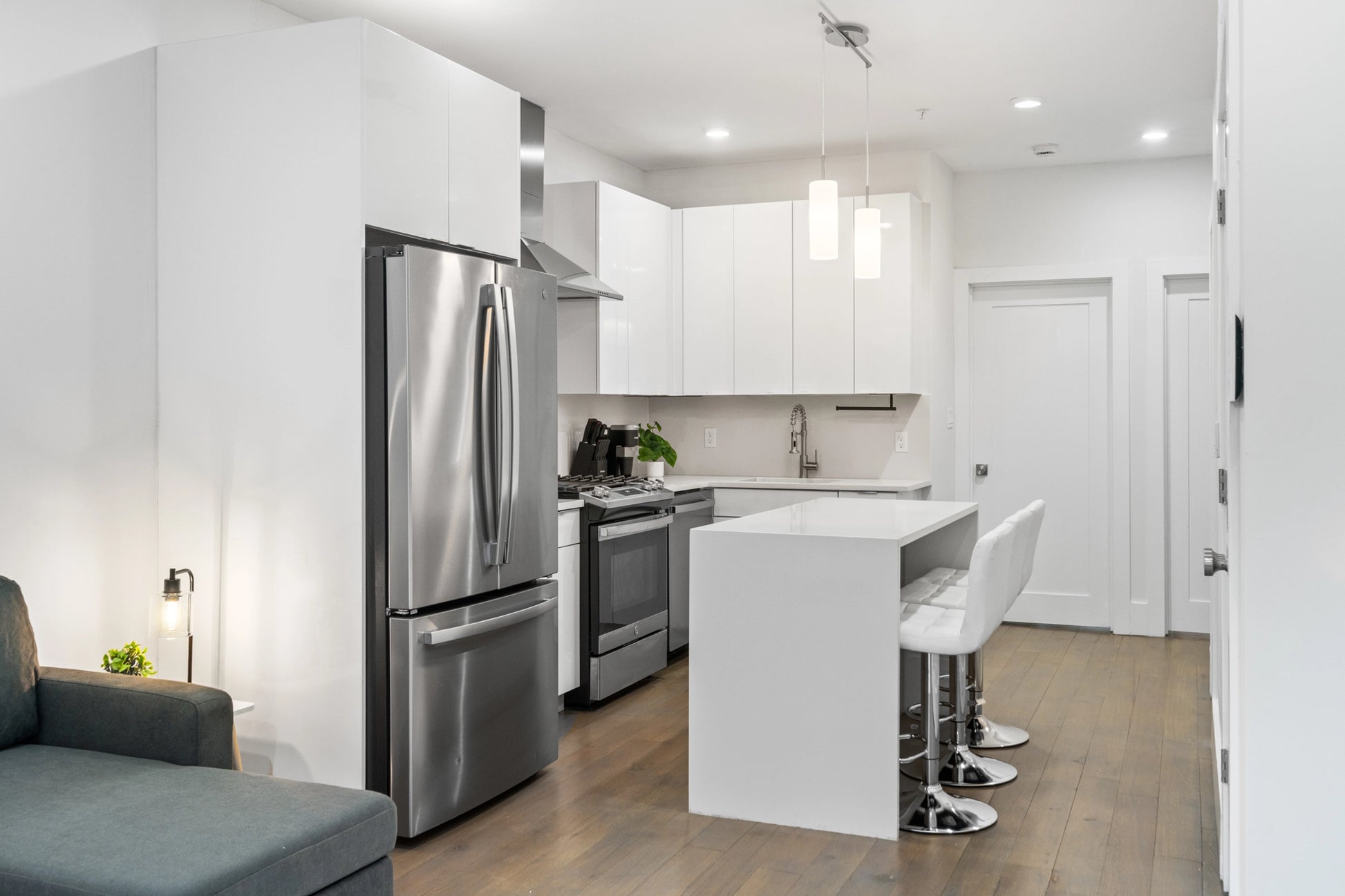 This modern Jersey City apartment is captured through professional Airbnb photography that highlights its clean design, bright interiors, and thoughtfully arranged living spaces. Wide-angle shots showcase the open-concept living and dining area, where large bay-style windows bring in natural light and create a warm, inviting atmosphere. The contemporary kitchen—featuring glossy white cabinetry, stainless steel appliances, and a sleek island—is photographed to emphasize both function and style, appealing to short-term rental guests seeking comfort and convenience.