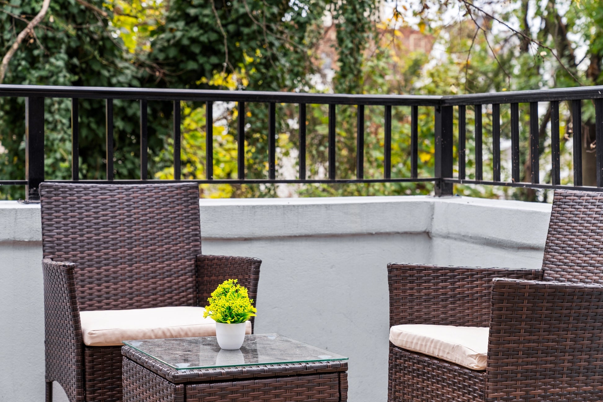 Detail shots highlight the apartment’s décor and textures, including workspace elements, ambient lighting, and styled bedroom accents. The bathroom is captured with clarity, emphasizing modern tile work, updated fixtures, and the overall cleanliness expected from a high-performing Airbnb listing. Exterior images of the private balcony show an intimate outdoor area perfect for relaxation, giving guests a complete sense of the property’s lifestyle experience.