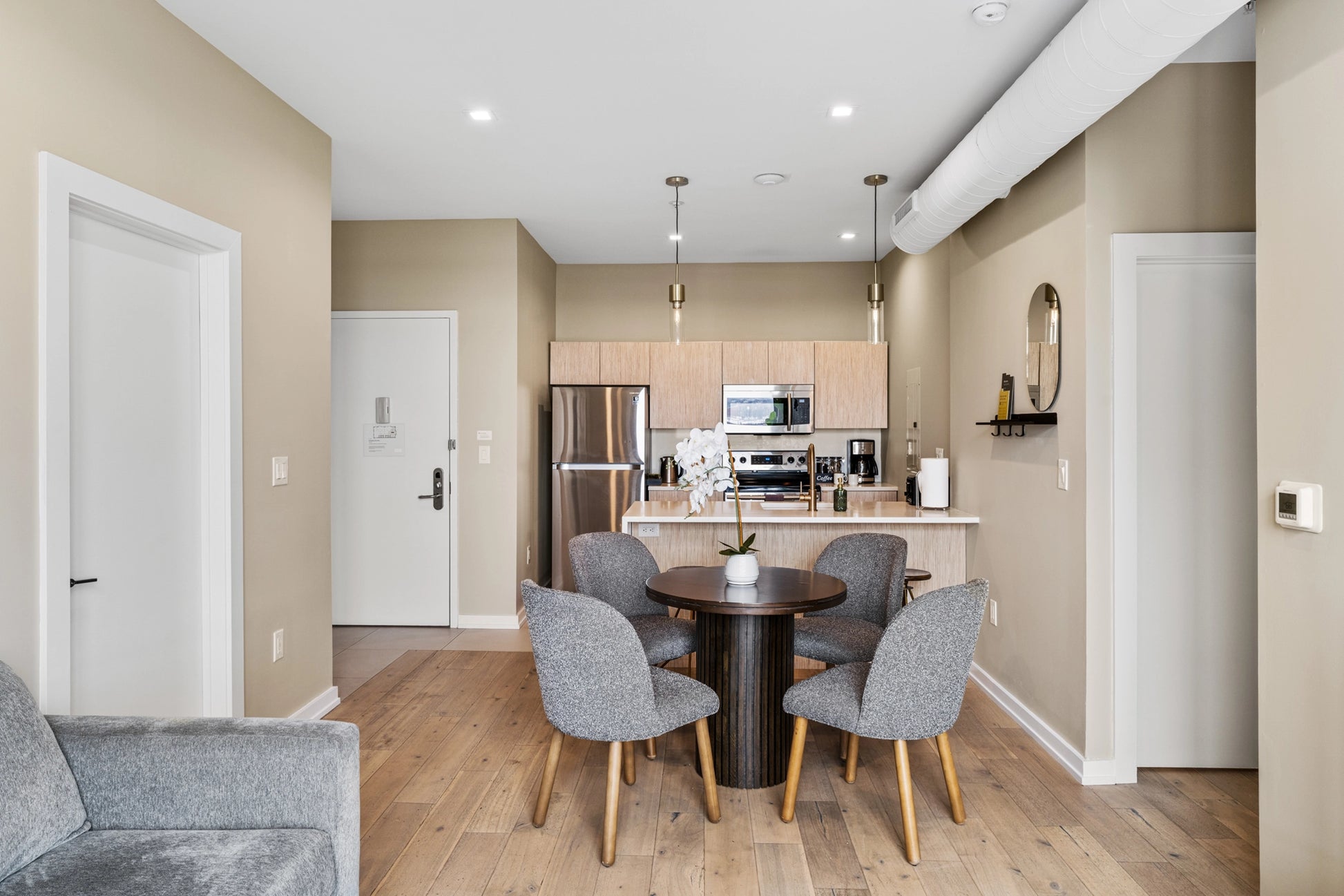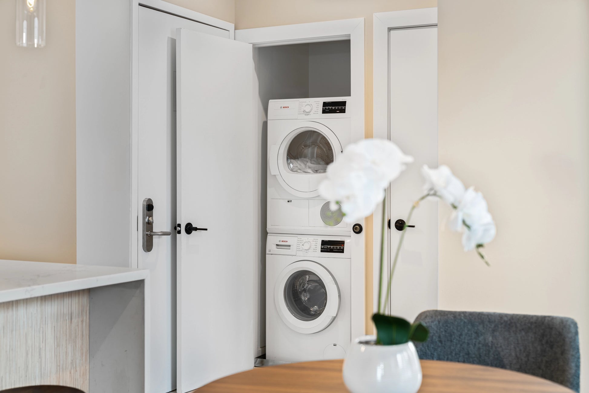 In addition to the wide interior perspectives, the photo set includes detail oriented lifestyle images that showcase amenities and interior accents throughout the apartments. These close up shots highlight décor elements, plants, entry systems, and carefully styled surfaces that add personality and a welcoming atmosphere to the spaces.